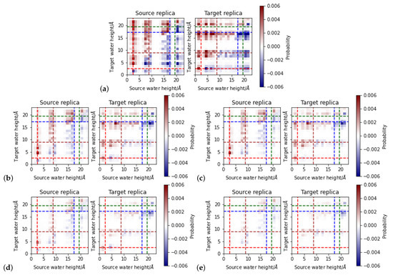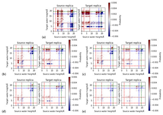 Position-dependent acceptance ratio for proton exchange in “down” models. Blue and minus signs indicate “downwards” (direction from Y288 to H96) transitions and red indicates “upwards” (direction from H96 to Y288) transitions. Dashed lines indicate the average position of protein residues E101 (red), S365 (brown), K362 (blue), and T359 (green). (a) Energy as only acceptance criterion, (b) existence of a hydrogen-bonded connection in the source replica (c) existence of a directed hydrogen-bonded connection in the source replica, (d) existence of a directed hydrogen-bonded connection in the source replica, and (e) existence of a directed hydrogen-bonded connection in the source and target replica as additional criterion.
