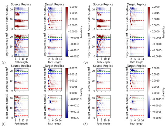 Difference in position-dependent acceptance for proton exchange between “downwards” (direction from Y288 to H96) transitions and “upwards” (direction from H96 to Y288) transitions, as a function of the transition step size as measured by the length of the hydrogen-bonded chain in “up” models. Blue and negative signs represent more “downwards”, and red represents more “upwards” transitions. The probabilities for “upwards” and “downwards” are shown separately in supplementary Figure S5. Dashed lines indicate the average position of protein residues E101 (red), S365 (brown), K362 (blue), and T359 (green). Criteria for proton transfer acceptance other than energy: (a) existence of a hydrogen-bonded connection in the source replica, (b) existence of a directed hydrogen-bonded connection in the source replica, (c) existence of a directed hydrogen-bonded connection in the source replica, and (d) existence of a directed hydrogen-bonded connection in the source and target replica as additional criterion.