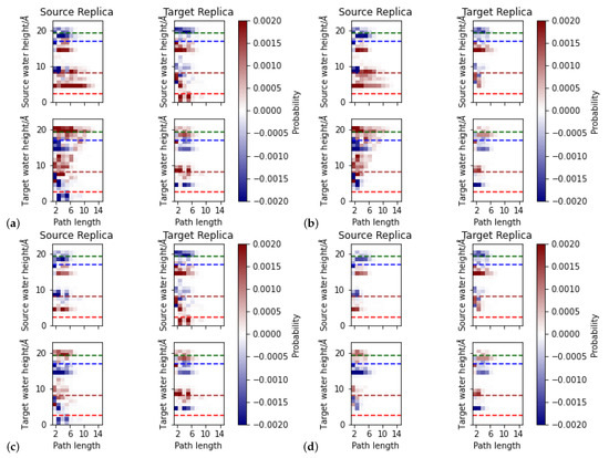 Difference in position-dependent acceptance for proton exchange between “downwards” (direction from Y288 to H96) transitions and “upwards” (direction from H96 to Y288) transitions, as a function of the transition step size as measured by the length of the hydrogen-bonded chain in “down” models. Blue and negative signs represent more “downwards”, and red represents more “upwards” transitions. The probabilities for “upwards” and “downwards” are shown separately in supplementary Figure S6. Dashed lines indicate the average position of protein residues E101 (red), S365 (brown), K362 (blue), and T359 (green). Criteria for proton transfer acceptance other than energy: (a) existence of a hydrogen-bonded connection in the source replica, (b) existence of a directed hydrogen-bonded connection in the source replica, (c) existence of a directed hydrogen-bonded connection in the source replica, and (d) existence of a directed hydrogen-bonded connection in the source and target replica as additional criterion.