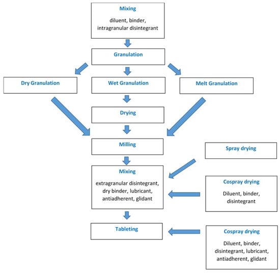 In order to facilitate direct compression, specialized DC excipients and grades of some high-dose drugs have been developed and marketed. These grades are prepared by various techniques to obtain particles with suitable micromeritic and physicomechanical properties. Spray drying is such a strategy that has been extensively exploited in recent decades. It is a continuous one-step process producing powders with uniform particle size and approximately spherical particle shape, rendering them good flowability. Also, the isodiametric shape of spray-dried particles helps particle rearrangement in the die during tableting leading to enhanced compaction behaviour []. The process parameters can be controlled, and the formulation can be optimized by employing process analytical technology (PAT) and quality-by-design (QbD) principles [,,,]. With appropriate process and formulation design, it is possible to produce a ready-to-compress (RTC) mixture or an almost final product that needs only one last mixing step with binder/disintegrant/lubricant before tableting (Figure 1).