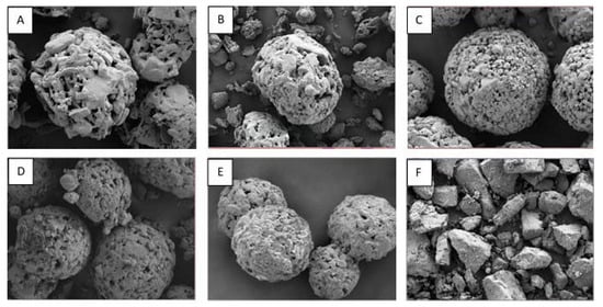 Scanning electron microscopy (SEM) images for lacose-based excipients: (A) Cellactose®, (B) MicroceLac®, (C) StarLac®, (D) CombiLac® (E) FlowLac® 100 and (F) Crystalline lactose monohydrate (GranuLac®). From Meggle Company website [].