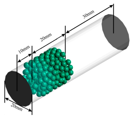 For the calculations, a cylindrical area with a diameter of 20 mm and a length of 20 mm, filled with spherical granules, was selected (Figure 2). The number of granules was from 221 to 235 units for the case of mm, from 98 to 103 units for the case of mm, and from 45 to 47 units for the case of mm. For a small size mm, the number of granules is significantly larger. In this case, the deviation in the number of granules relative to the average value is from 4.4% ( mm) to 6.3% ( mm).