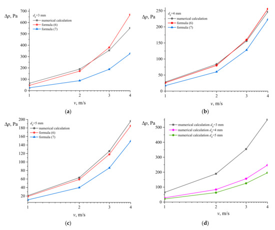 Dependence of the pressure drop on the gas flow rate: (a) mm; (b) mm; (c) mm; (d) comparison of the numerical simulation results.