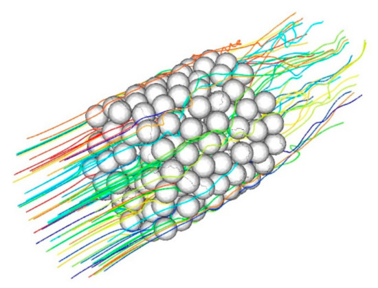 After calculating the gas flow field, we calculated the particle motion using Formulas (4) and (5) in ANSYS Fluent (v. 19.2). Spherical particles start at the computational domain’s entrance and their direction is normal to the boundary. Then, the particles move against the background of the calculated gas field; for the presented calculations, we started with 30,000 particles. Only the trajectory of motion of the particle center was considered; the density and diameter of the particle affect the inertia and contribute to the deposition, with a sharp deviation of the flow near a solid surface. The particles that reached the surface of the filter granules were considered settled, and were excluded from the further calculation of the trajectories’ motion. The particles that reached the surface of the tube were reflected, and their further movement was calculated.