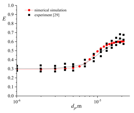 We performed a comparative calculation to verify our research. In studies [28,29], the filtration efficiency curve for a granular filter with a granule diameter of mm is presented. We constructed a cylindrical region with a granular filter, as in [29], calculated the gas movement at a similar velocity of 0.345 m/s, and calculated the motion and deposition of aerosol particles with a diameter of 1 µm to 21 µm. The results are presented in Figure 5. The result of our calculation is in good agreement with the results of the experimental studies.