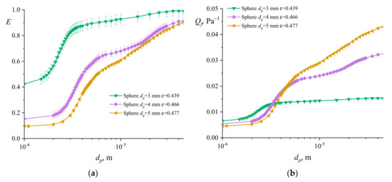 Figure 6a shows the results of a study of the particle deposition efficiency for the filter models with spherical granules for various values of the porosity of the medium. Calculations of the efficiency were carried out for all of the constructed geometries, and thus, for each value of the granule diameter, we averaged the results over five calculations. We can see that the filter with mm granules has the best efficiency among the cases of our calculations. In this case, the largest scatter in the results (up to 8.6%) can also be observed for granules with a diameter of 3 mm. For packages of granules with a diameter of 5 mm, the scatter of the results is not large (up to 2.35%).