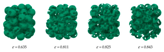 Furthermore, we studied the possibility of improving the filtering properties of granular filters with spherical granules. For this, we modified the filter with porous granules with a diameter of mm (Figure 7). The micropore diameter was mm. By increasing and decreasing the distance between the micropores, we controlled the porosity value. The porosity parameters of the created models are presented in Table 2.