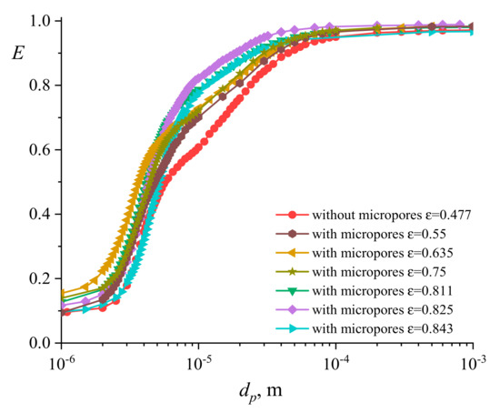Figure 8 shows that with the modification of a granular filter with micropores, an increase in particle deposition efficiency is observed in the entire range of particle sizes, which ranges from 10% to 25%. In this case, with a slight increase in porosity (, ), the deposition efficiency curves qualitatively repeat the character of the curve, as for a bed of granules without micropores. Then, with an increase in porosity (), the character of the curve begins to change. Models of filters with different total porosity values show different results for different ranges of values of particle diameters. Thus, a filter with total porosity demonstrates an efficiency of particle deposition higher than others by 5–8% in the area of particles up to 2∙10−6 m, and a further increase in porosity leads to a decrease in efficiency. Then, we can observe the intersection of the curves of the aerosol particle deposition efficiency for different porosity values. In the area of large particles, filters with total porosity of , and work better. A structure with porosity has the most excellent efficiency, and a further increase in porosity also leads to a decrease in efficiency. Thus, small and large particles have their own porosity, which determines the maximum deposition efficiency.