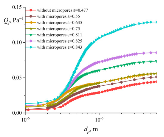 Figure 10 shows the dependence of the filter quality factor on the particle diameter. The original filter model without micropores has the minimum value of the quality factor. This result is due to the combination of the study results of the particle deposition efficiency and pressure drop; in both indicators, the model without micropores is inferior to the models with micropores. Since the pressure drop makes the main contribution to the quality factor, the structure with the highest porosity value , which corresponds to the lowest pressure drop, has the highest performance.