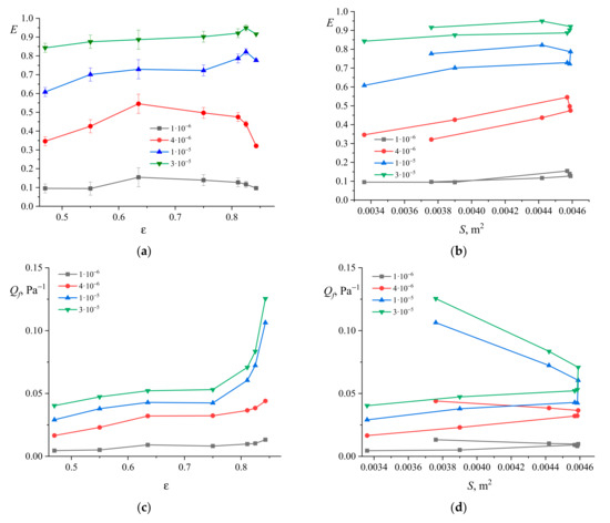 Obviously, the addition of multiple pores should increase the total surface area of the bed. However, too many pores can reduce the surface area of the bed. Figure 9a shows the calculated dependence of the bed area on porosity. The largest surface area is observed for the porosity range . Here the analysis of the averaged efficiency curves is carried out; the analysis of the scatter of the results for specific values of the diameter of the aerosol particles is discussed below. This conclusion is valid for the special cases of geometric characteristics that we have chosen for the calculations in this study.