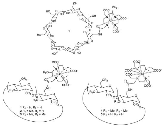 We have focused our study on cyclodextrins (CDs) as interesting and versatile scaffolds to design potential MRI contrast agents. CDs are natural cyclic oligosaccharides with 6, 7, or 8 glucose units, issued from starch degradation by glucosyltransferase (CGTase) and so-called α-, β-, and γ-CD, respectively [21]. Cyclodextrins have primary (C-6) and secondary hydroxyl groups (C-2, C-3) forming the smaller and larger crowns of the cone, respectively. For β-CD, this cone shape is especially reinforced by hydrogen bonding between two adjacent units (C-2-OH and C-3-OH). The 21 alcohol functions also favor interactions with water molecules and improve the solubility in aqueous medium. The internal cavity (host), composed of glycosidic oxygen and C-H groups, is less hydrophilic and makes possible intermolecular interactions with organic molecules (guests). Host–guest inclusion complexes improve the water solubility and the stability of the guests, such as small bioactive molecules. In the context of MRI contrast agents, cyclodextrins have been mainly explored in three distinct approaches in the objective of modulating the rotational motion, thus improving relaxivity: (i) as host to form inclusion complexes with contrast agents functionalized by lipophilic groups [22,23,24], (ii) as high molecular weight scaffolds by covalently immobilizing one or more Gd3+ complexes [25,26], and (iii) as a platform for Ln3+ complexation [27,28].