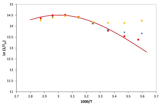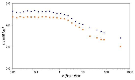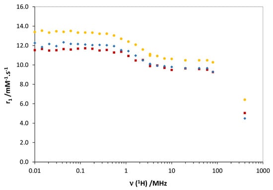 Nuclear Magnetic Relaxation Dispersion (NMRD) profiles describe the efficacy of the complex in terms of relaxivity as a function of the magnetic field, and they are helpful to characterize the parameters governing proton relaxivity [37,38]. Typically, the analysis of NMRD curves allows for estimating some of the physicochemical parameters that determine relaxivity, in particular the rotational correlation time (τR), the water exchange rate (kex), the number of water molecules directly coordinated to Gd3+ (q), and the electronic relaxation rates. However, it is important to determine a maximum of these parameters independently for the reliability of the results.