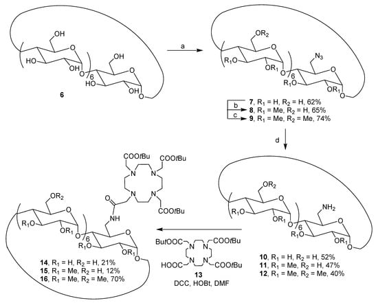 Synthesis route of 6-O-monoamino-β-cyclodextrins precursors 10–12 and DOTAMA derivatives 14–16.