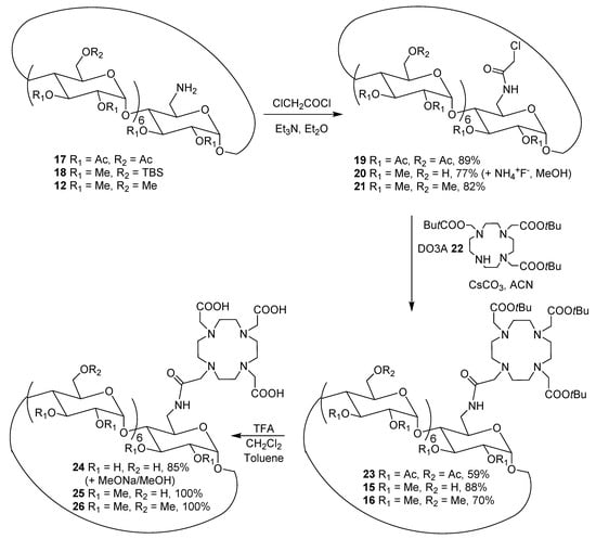 Thus, the mono(6-amino-6-deoxy)-β-CD 7 was quantitatively peracetylated using anhydride acetic in pyridine and the azido function was then reduced by catalytic hydrogenation in 50% yield (see Scheme 1 in experimental section) (Supplementary Materials). From the same precursor 7, the mono(6-amino-6-deoxy)-2,3-permethyl-β-CD protected with silyl groups at 6 positions 18 was obtained in three steps by silylation of the residual primary alcohols of the intermediate mono(6-azido-6-deoxy)-β-CD 7 (Scheme 1), followed by a permethylation of the secondary face and after Staudinger reduction of azido group in 51% over yield (see Scheme 2 in experimental section) (Supplementary Materials). The two mono(6-amino-6-deoxy)-CDs 17 and 18 were substituted with chloromethylacetyl group in 89% and 77% yields, respectively (Supplementary Materials). From precursor 18, an additional deprotection step of the TBS group was required using ammonium fluoride, providing quantitatively compound 20 (see Scheme 3 in experimental section) (Supplementary Materials). The coupling was carried out from the free secondary amine of the commercially available DO3A derivative 22 bearing three tert-butylester groups. The DOTAMA ligand was introduced with yields varying between 59% and 88% leading the compounds 23, 15, and 16, thereby improving the initial yields obtained with the direct strategy (21% and 12% yields for 14 and 15, respectively) (Scheme 1 and Scheme 2).