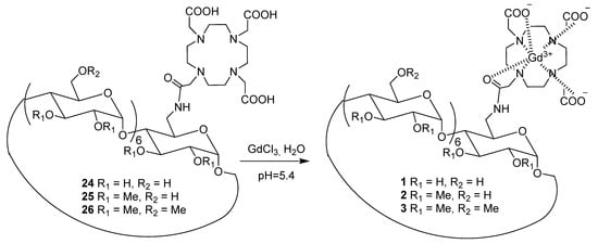 Finally, Gd3+ complexes of ligands 24–26 were prepared in the presence of one equivalent of gadolinium chloride hexahydrate in aqueous medium at pH 5.4 (Scheme 3).