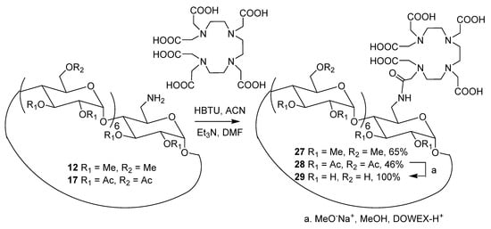 As the direct substitution of the perhydroxylated 6-O-monoamino-β-CD 10 did not occur (Scheme 1), the peracetylated derivated 17 having a higher solubility in organic solvents was tested. The introduction of the ligand was then possible with 46% yield. This result was confirmed by 13C NMR spectrometry thanks to the characteristic signals of carbonyl function at 171 ppm and the methylene groups of the TTHAMA ligand (57.5–52.5 ppm) (Supplementary Materials). The mass spectrometry analysis was in accordance with the structure 28 (Supplementary Materials). The perhydroxylated compound 29 was obtained quantitatively by basic treatment and purification on Dowex column. The disappearance of the acetyl signals at 21.6 ppm was observed by 13C NMR and the molecular peak at m/z = 1610.6 [M + H]+ confirmed the structure (Supplementary Materials).