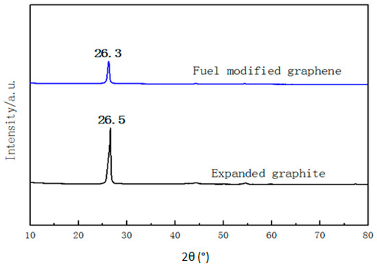 The XRD patterns of expended graphite (before DBDP-assisted ball milling) and fuel-modified graphene (after DBDP-assisted ball milling) are presented in Figure 4. A sharp diffraction peak in the XRD pattern of expended graphite was located at 2θ = 26.5, which can be attributed to the contribution of (002) crystal plane of hexagonal graphite. A diffraction peak of fuel-modified graphene was located at 2θ = 26.3°. The diffraction peak at 26° was assigned to the stacking of graphene sheets [18,19]. Obviously, the diffraction peak of fuel modified graphene was weakened dramatically in comparison with that of the expended graphite, indicating that the expended graphite tended to be amorphous and a downsizing phenomenon occurred after DBDP-assisted ball milling [20]. At the same time, the position of the diffraction peak of fuel-modified graphene shifted slightly to the left in comparison with that of the expended graphite, which means that interlayer spacing increased after DBDP-assisted ball milling.
