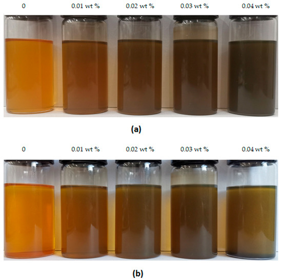 Digital images of 0# diesel oil (oil sample 1) with different concentrations of graphene additives settled for (a) 0 days and (b) 20 days.