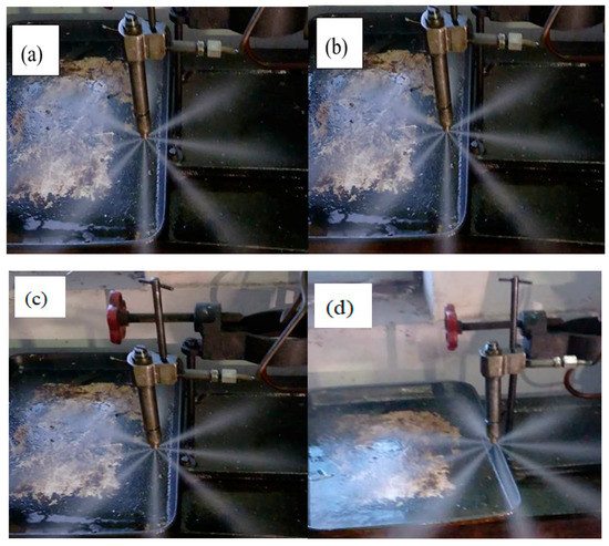 Atomization properties tests of (a) 0# diesel oil (oil sample 1); (b) 0# diesel oil (oil sample 1) with 0.03 wt % graphene additives; (c) 0# diesel oil (oil sample 2); (d) 0# diesel oil (oil sample 2) with 0.03 wt % graphene additives.