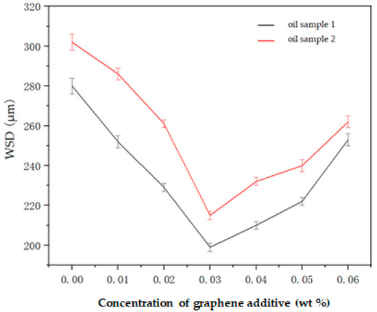 The wear scar diameter (WSD) of 0# diesel oil (oil sample 1 and oil sample 2) with different concentrations of graphene additive.