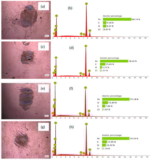 Figure 11 shows the optical micrograph of the worn surfaces on steel balls lubricated with pure 0# diesel oil (oil sample 1 and oil sample 2) and compound oil containing 0.03 wt % graphene additives. As shown in Figure 11a,e, some severe adhesion phenomena occurred due to the loss of the tribofilm on the steel ball worn surfaces. The EDS patters of the steel disc worn surfaces are provided in Figure 11b,d,f,h. Obviously, the worn surface lubricated with compound oil containing 0.03 wt % graphene additive had a higher C than the worn surface lubricated with pure 0# diesel oil. This showed that self-lubricating film formed on the worn surface was thicker because of the addition of graphene additives into 0# diesel oil. This explains the increase in COF and WSD when using 0# diesel oil (oil sample 1 and oil sample 2) alone (Figure 9 and Figure 10). When 0# diesel oil contains graphene additives, the adhesion phenomena of the steel ball surfaces were greatly reduced. This can be attributed to the formation of graphene friction film, which prevents the friction pair surface from contacting directly. Graphene possesses an extremely thin laminated structure, low shear stress, and high load-carrying capacity. These ensure that graphene can easily enter the rubbing surfaces and form a low-shear, high durability oil film to prevent direct metal to metal contacts, which results in the reduction of friction and wear. Therefore, graphene additives effectively improve the lubrication performance of 0# diesel oil (oil sample 1 and oil sample 2).