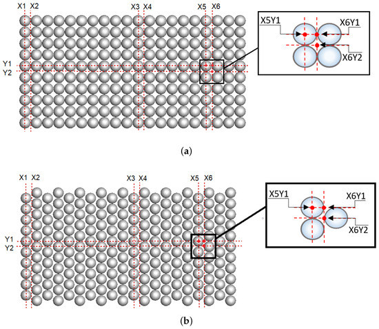 Ordered (a) and shifted (b) arrangement of sphere rows. Subfigures show the localizations of the control points.