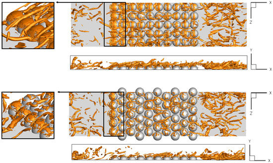 In all cases, the computations started with the uniform velocity in the ‘x’-direction equal to , with random disturbances at the level of assumed for all velocity components. These artificial fluctuations induced the appearance of natural turbulent structures and the flow adapted to the forcing imposed by the constant pressure gradient. After the initial transient phase (), the flow could be considered as fully developed. Figure 5 shows the Q-parameter () in the vicinity of the lower walls in the configurations S2.0o and S2.0s. The Q-parameter is one of the quantities that are often used to indicate vortical structures. It is defined as , where and are the symmetrical and anti-symmetrical parts of the velocity gradient tensor. Here, the Q-parameter shows long streamwise-oriented vortices formed in between the spheres and small vortices occurring on the sphere surfaces. It can be seen that on the flat parts of the channel, flow behavior is very similar, whereas significant differences are seen in the vicinity of the spheres. In the configuration S2.0o, the number of long vortices is distinctly larger and its occurrence is more regular. In the zoomed figures of the regions of the first rows of the spheres, it can be seen that the longitudinal thin vortices originate in the gaps between the spheres. Depending on sphere arrangement, they either extend along the ‘x’-direction being pulled by the mean flow (S2.0o) or are destroyed by the subsequent row of the spheres (S2.0s). In both cases, however, these vortices reveal strongly turbulent flow behavior near the spheres.