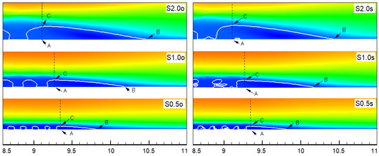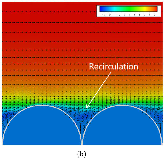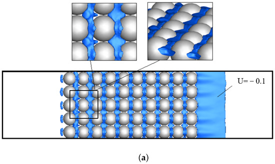 Figure 7 shows the contours of the time-averaged streamwise velocity that was additionally averaged along the ‘z’-direction. Point A indicates the localization of the last row of the spheres, points B and C correspond to the length and height of the recirculation zones, respectively. It can be seen that these parameters change depending on the sphere diameter and arrangement. Their detailed values are given in Table 2.