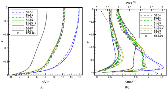 Profiles of the time-averaged streamwise velocity (a) and the profiles of the fluctuations of the streamwise and wall-normal velocity components (b) along the channel height at .