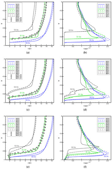 Similar conclusions can be drawn regarding the solutions in the points X2Y2, X4Y2, and X6Y2. Here, again only for the case S2.0s, the profiles at points X4Y2 and X6Y2 visibly diverge (see Figure 10e). In comparison to the solutions at points X4Y1 and X6Y1, the important differences are: (i) the near-wall recirculation zone is weaker; (ii) in the close vicinity of the spheres ( in the case S2.0s) the mean velocity at the location X4 is the largest and it is the smallest at X6; in the cases X4Y1 and X6Y1, the opposite situation is observed, i.e., the mean velocity at the location X6 is the largest. Note, that the same behavior is found for the fluctuation profiles.