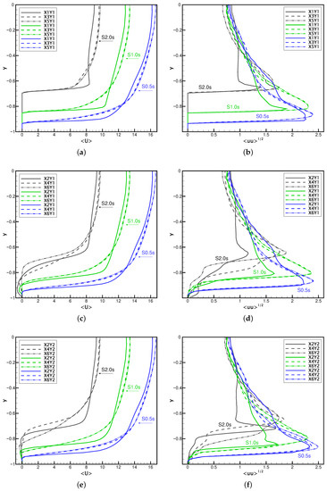 Profiles of the time-averaged streamwise velocity (a,c,e) and its fluctuations (b,d,f) along the channel height at the selected control points X and Y defined in Figure 3b. The results for the configurations S0.5s, S1.0s, and S2.0s.