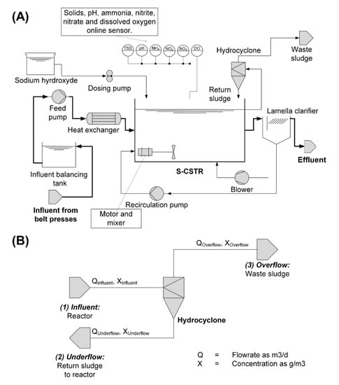(A) Flowchart of the suspended sludge continuous stirred tank reactor (S-CSTR) and (B) schematic representation of the mass-balance to the hydrocyclone.