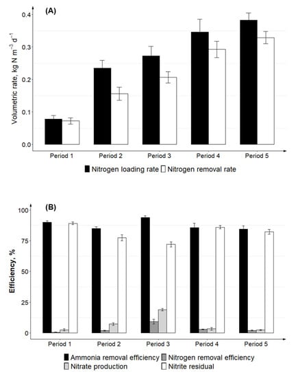 (A) Nitrogen loading and removal rates (B) and efficiencies with ammonia removal efficiency, nitrogen removal efficiency, nitrate production, and nitrite residual for Period 1 to Period 5 (B).