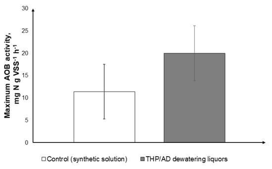Previous studies reported inhibition and operational difficulties with THP/AD dewatering liquors [5,6]. This was not observed in this study; as Figure 2 clearly shows, the ammonia removal efficiency was always 75% and it was not impacted by increasing loading rates. Additionally, the maximum AOB activity measured was 20.0 mg N g VSS−1 h−1 for THP/AD dewatering liquors and 11.4 mg N g VSS−1 h−1 (Figure 3). No inhibition was observed in the ex-situ batch experiment activity tests either, in both control (synthetic solutions) and THP/AD. Previous studies reported a reduction of AOB activity by 40–60% AOB in THP/AD [5,6], but the same was not observed in this study. Our results align with the reports by Driessen et al. (2020) [7] who demonstrated successful nitrogen removal with a granular sludge deammonification process from THP/AD dewatering liquors (NRR 1.0–2.0 kg N m−3 d−1). Hence, this study provides additional evidence that deammonification can be used as a nitrogen removal process for ammonia from THP/AD dewatering liquors and concerns about inhibition must be further investigated on a case-by-case basis.