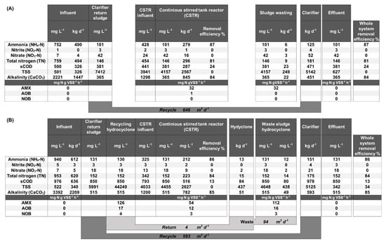 The S-CSTR mass balance, with and without hydrocyclone, is presented in Figure 4. The MLSS and the TSS wasted in the reactor were 4157 mg MLSS L−1 and 249 kg TSS d−1 without hydrocyclone, and 4450 mg MLSS L−1 and 438 kg TSS d−1 with hydrocyclone. The hydrocyclone allowed a solids retention of 65% on average (Figure 4B). The AMX activity increased to 54.3 mg N g VSS−1 h−1 (Figure 4B) when hydrocyclone was operated compared with only 31.8 mg N g VSS−1 h−1 without it. The highest AMX activity measured in the hydrocyclone underflow was 111.5 mg N g VSS−1 h−1 (Figure 4B). Based on the mass balance, the AMX retention with the hydrocyclone was estimated at 70%, while the AOB and NOB retention efficiency was 46% and 58%, respectively. This data very clearly indicates that slow-growing AMX was successfully retained in the S-CSTR with the hydrocyclone. Previous studies based on modelling or only a few data points reported solids separation in hydrocyclones to be between 60–90% [17,18]. The authors suggested that the superior biomass separation via a screen of 91% lead to an additional improvement of 10–12% in nitrogen removal ability [18]. However, this data was not validated by field data. Others also observed higher AMX activity in the underflow of the hydrocyclone compared to the biological reactor of 2.0–15.0 mg NO2− N g TSS−1 h−1 [20]. However, comparisons of this study with Wett (2010) [20] are limited due to differences in the activity test methodology. When treating manure digestate dewatering liquors, Kwon (2019) [22] measured up to 90% of AMX retention in a system with an hydrocyclone, however there was also instability with periods of excessive AMX washout.