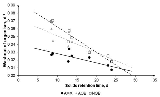 The washout per organism was calculated using the SRT for the biological reactor well as the retention by the organism (AOB, NOB, and AMX) according to Equation (2) [18].