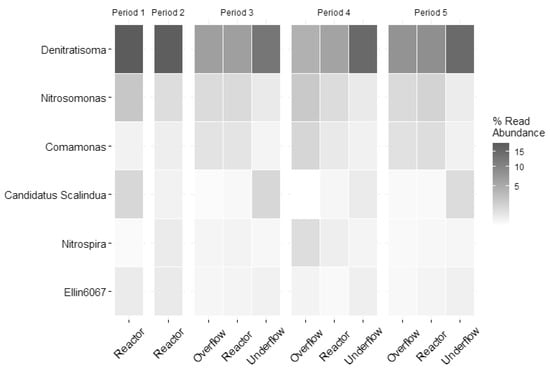 The microbiome analysis was key to identifying Denitratisoma as the dominant group in the reactor. Denitratisoma is known for its ability to use nitrate as electron acceptor [38] and is reported, in high abundance, in deammonification technologies treating conventional AD dewatering liquors [39]. Candidatus Scalindua was identified as the dominant AMX genus in the S-CSTR (Figure 6). Candidatus Scalindua has been previously described in non-engineered ecosystems or saltwater deammonification systems [40]. Dewatering liquors from conventional AD and THP/AD have a high salt of content 5000–6000 µS cm−1 [41,42]. Further to this, a recent study shows the relevance of Candidatus Scalindua in freshwater environments too, demonstrating the versatility and potential underestimation of this genus in deammonification systems [43]. The abundance of Candidatus Scalindua was around 0.2–0.5% in the biological reactor, 1.2% in the underflow of the hydrocyclone, and 0.1% in the hydrocyclone overflow (Figure 6). This also clearly corroborated that indeed AMX was successfully retained with the hydrocyclone. Kwon (2019) [22] also identified a higher abundance of 8.3% in the underflow of the hydrocyclone compared to 7.1% in the biological reactor. Previous studies reported an archaeal fraction of 1.4–3.8% in suspended sludge deammonification technologies [44] and AMX abundances of 0.3–9.3% [22,45]. The microbiome results from this study can also be used as an indicator due to the limited sample size.