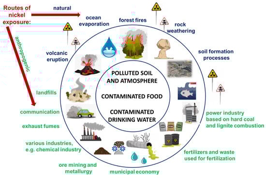 Nickel is widely distributed in the environment, and can be found in water, air, soil, or food because of its natural occurrence in nature and anthropogenic origin (Figure 1). It is the 24th most abundant metal in the earth’s crust and accounts for about 3% of the earth’s composition [,]. The natural sources of atmospheric nickel include dusts from volcanic emissions, meteoric dust, weathering of soils and rocks, forest fires, and sea salt spray [,]. From 30% to 50% of natural Ni sources are generated by soil particles moved by wind, blown from eroded areas [], whereas almost 90% of the global anthropogenic Ni emissions are generated by oil combustion []. About 6–20 ng/m3 of nickel is present in ambient air, whereas air contaminated by anthropogenic sources could include 150 ng/m3 of nickel []. Solubilization of nickel compounds from soils as well as biological cycles are the main sources of nickel in water []. The content and mobility of nickel in soils depends on its compound solubility, pH, and soil types []. At pH < 6.5, nickel compounds are soluble in water, whereas at above pH > 6.7, insoluble hydroxides are usually present. Nickel salts such as chloride, nitrate, and sulfate (salts of strong acids, organic acids) are soluble in water, whereas metallic nickel, nickel sulfides, and nickel oxides, as well as nickel salts of weak inorganic acids, are poorly water-soluble []. Moreover, the use of pesticides and fertilizer increases the nickel content in soils and could be a source of heavy metals in food.