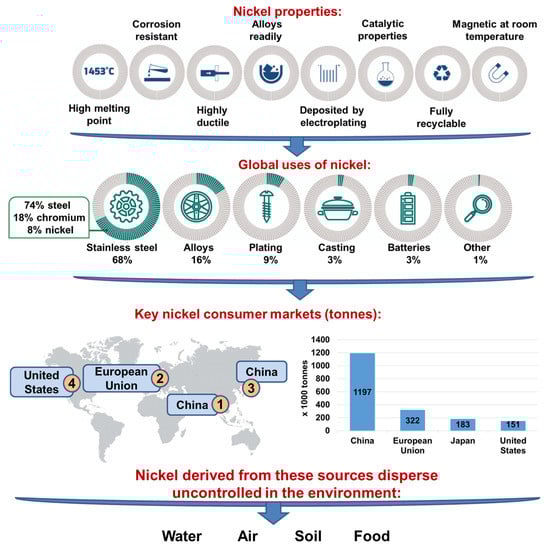 Due to its properties, Nickel (Ni) can be utilized in various branches of industry and applied in many processes, such as electroplating, mineral processing, production of stainless steel, batteries, metallic alloys, coins, ceramic coloring, and paint [,]. The details of nickel properties, global uses, as well as nickel consumer markets are presented in Figure 2. As a consequence, huge amounts of nickel-containing wastes, e.g., spent batteries, catalysts, waste electrical and electronic equipment as well as wastewaters and electrolytes are generated and leach into the environment [,].