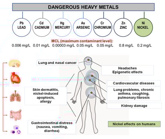 Drinking of contaminated water, inhalation of particulates from the atmosphere, eating of contaminated food, due to the toxic and carcinogenic properties of nickel results in harmful effects to humans as well as to other living organisms []. This metal is capable of bioaccumulation in the aquatic environment and biomagnifications along the food chain [,,]. Nickel causes kidney and lung diseases, chronic asthma, cough, pulmonary fibrosis, gastrointestinal distress (nausea, vomiting, diarrhea), skin dermatitis, nickel-induced apoptosis, allergy, headaches, cardiovascular diseases, lung and nasal cancer, as well as epigenetic effects [,,,,] (Figure 3). A tolerable daily intake of nickel is equal to 2.8 µg/kg body weight (b.w.) []. As is indicate in Figure 3, the maximum contaminant level (MCL) of heavy metals such as lead (Pb), cadmium (Cd), mercury (Hg), arsenic (As), chromium (Cr), zinc (Zn) and nickel (Ni) that is allowed in drinking water is in the range from 0.00003 to 0.8 mg/L (establish by the United States Environmental Protection Agency, USEPA) []. As was suggested by the World Health Organization, the permissible nickel concentration in drinking water and wastewaters should not exceed 0.02 mg/L and 900 mg/L, respectively [].