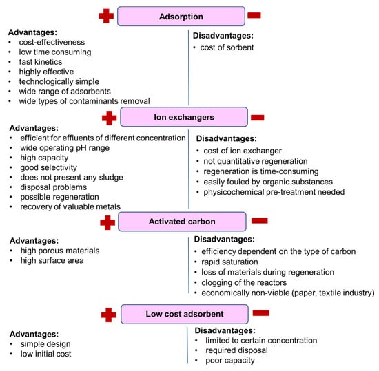 Taking into account nickel deficit due to its large demand by different industrial sectors, its widespread dispersion and persistence in the environment, and toxic effects on living organisms, its recycling and reuse is essential from the economic (new sources of valuable metal) as well as ecological (environment protection, wastes reduction) points of view. Despite of some technologies proposed for reclamation of solid matrices containing nickel, e.g., phytoremediation, solvent extraction, immobilization [,], etc., the most effective way to avoid nickel diffusion in the environment is its removal from industrial effluents using efficient treatment methods [,,]. Nickel is removed by using various physicochemical methods such as coagulation, flocculation [], electrocoagulation [], co-precipitation [], reverse osmosis, electrodialysis [], ultrafiltration, complexation [], membrane separation [], adsorption [], and ion exchange []. These techniques have notable limitations, such as incomplete removal, low efficiency, high operating and capital costs, sensitivity to operating conditions, generation of by-products, and excess sludge, which require further treatment; therefore, only few of them are suitable for application on a large-scale [,,,,,,,,]. A comparison of treatment methods applied for nickel removal both with their advantages and disadvantages are presented in Figure 4. Adsorption, due to its advantageous such as cost-effectiveness, efficiency, easiness of application, effectiveness, high adsorption capacities of polymeric adsorbents, applicability for low pollutant concentrations, and non-toxic by products, is already applied in nickel removal from wastewaters [,,,,,]. A large amount of adsorbents, both inorganic and organic, were studied for Ni(II) ion removal from aqueous solutions, such as carbonaceous materials (coal, lignite, commercial activated carbon, activated carbon from waste materials), industrial and agricultural wastes (fly ash, sugarcane bagasse, red mud, sludge, peels, brans, barks, coir pith, tea), polymeric adsorbents (biopolymers, synthetic polymers), mineral adsorbents (clay, zeolite, siliceous materials) and bio-adsorbents (algae, fungi, bacteria) [,,,,,,,,].