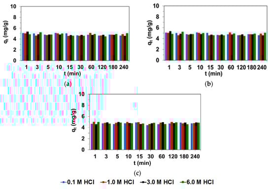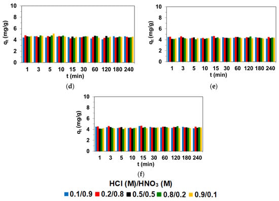 A series of shaking time studies for Ni(II) ions was carried out with 100 mg/L initial metal concentration at 25 °C and different HCl and HNO3 acids concentrations (HCl (M): 0.1; 1.0; 3.0; 6.0; HCl (M)/HNO3 (M): 0.1/0.9; 0.2/0.8; 0.5/0.5; 0.8/0.2; 0.9/0.1). The effect of phase contact times ranging from 1 min to 240 min on the Ni(II) adsorption was also examined. The adsorption of 100 mg/L concentration of Ni(II) onto selected adsorbents for 4 h was studied in this paper and compared to the results obtained previously [,,,] to choose the most efficient adsorbent for Ni(II) removal. The results are compared in Table 3, and presented in Figure 5 (chosen examples).