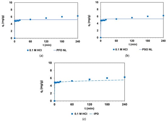 The time required to reach system equilibrium was above 240 min for TP220 [], whereas in the case of other adsorbents the qt values remained at a similar level at 1 min as well as at 240 min of phase contact time. As pointed out by Uzun and Guzel [], the time required to reach equilibrium (teq) during the Ni(II), Mn(II), Fe(II), Cu(II) adsorption on Merck 2514 activated carbon was equal to 134 h for Ni(II) (m = 1 g, V = 50 mL, C0 = 200 mg/L, 140 rpm) whereas during the Ni(II) adsorption on raw and modified Filtrasorb-400 by potassium bromate teq = 120 min (V = 400 mL, 1000 rpm) []. Adsorption of Ni(II) or separation was also carried out on ion exchange, resins e.g., Amberlite IRA-900 and a novel silica-based anion exchanger, AR-01 (Co(II), Ni(II) and Cu(II) from the nitrite solution) [], anion exchange Amberjet™ 4200 Cl and cation exchange Amberjet™ 1200 H [], anion exchanger D301R [], and chelating Purolite S950 resin [], but the time required to reach the system equilibrium was not determined. Adsorption of Ni(II) in the presence of complexing agents on the polyacrylate anion exchangers Amberlite IRA 458, Amberlite IRA 958 and Amberlite IRA 67 showed that the curve kinetics reached the plateau at the time greater than 30 min []. Effect of acid concentration were not observed in the HCl or HCl/HNO3 systems. The qt values were similar to those of the adsorption capacities in all examined aqueous solutions. Adsorption of Co(II), Ni(II), and Cu(II) from the nitrite solutions by anion exchangers was insignificant at the nitrite concentrations below 0.1 M, and then very slight increase in Ni(II) adsorption with the increasing concentration of nitrate ions was observed []. The experimental results obtained during the Ni(II) adsorption on S984, A830, SR7, A400TL, PSR2, PSR3 and AF5 adsorbents were modelled using the pseudo-first-order (PFO), pseudo-second-order (PSO), and intraparticle diffusion (IPD) kinetic models (Equations (2)–(4)). Taking into account the shape of kinetic curves and the arrangement of the experimental points, it was possible to calculate kinetic parameters at 0.1 M HCl using TP220 which exhibited the highest %R and adsorption capacity. The kinetic parameters were calculated and based on error analysis such as Marquardt’s percent standard deviation, determination coefficient, and adjusted R-squared values; then, the best fitted model was proposed. The obtained kinetic parameters as well as the errors values are collected in Table 4, whereas the fitting plots are presented in Figure 6. The mechanism of Ni(II) adsorption depends on the structure and functional groups of the adsorbent as well as on the physicochemical characteristics of the solute and adsorbent. The pseudo-first-order and pseudo-second-order kinetic models were based on the different assumption: PFO on the physisorption process, and PSO on the chemisorption process [,].