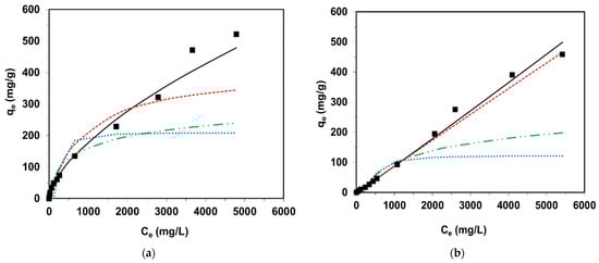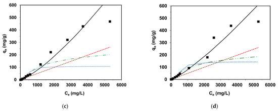 In order to explain the relationship between the Ni(II) concentration in the solution and sorbent phase at equilibrium, four isotherm models were chosen to describe the experimental data, i.e., the Langmuir, Freundlich, Temkin and Dubinin–Raduskievich models []. The non-linear forms of the above-mentioned models are as follows: