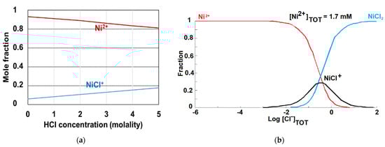 Distribution of nickel species in the HCl solution (a) with NiCl2 of 1.0 molality, (b) with Ni2+ of 1.7 mM concentration depending on the total concentration of Cl− ions.