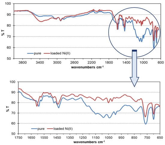 Peaks characteristic of bis-picolylamine (bis(2-pyridyl-methyl)amine) functional groups are also present, such as skeletal vibrations of pyridine, in-plane and out-of-plane C–C–H deformations in pyridine rings, stretching vibrations of C=N and C–N bonds, as well as stretching vibrations of aliphatic amino groups, (1590, 1471, 1437, 995–699 cm−1) [,,]. After the adsorption of Ni(II) on TP220, it was found that some of the bands reduced its intensity and the maxima of some peaks were moved to the major wave length. Such changes are observed in the region in which the functional groups were confirmed (C=N and C–N bond, pyridine, and aliphatic amine) indicating that the functional groups play a part in the mechanism of sorption and a coordinate bond with metals is formed [].