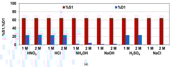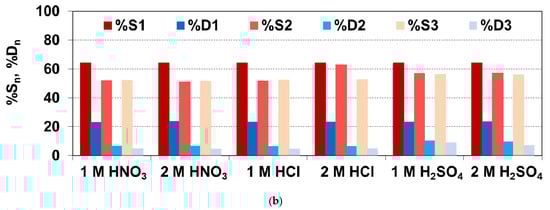 From the economic point of view, the high adsorption in a short time towards pollutions as well as the sorbent desorption possibility and its reuse are important factors influencing the total cost of adsorption removal. As was pointed out by Zong et al. [], the price of Dowex M4195 as well as TP220 is 134.6 USD/kg, therefore their regeneration and reuse could reduce the cost. Therefore, the desorption possibility and TP220 reuse were analyzed. As described in the experimental section, 50 mL of the eluting agents (HNO3, HCl, H2SO4, NH4OH, NaOH, NaCl) of the 1.0 M and 2.0 M concentrations were applied in the desorption test. The loaded anion exchange resin (sorption from 0.1 M HCl—100 mg Ni(II)/L, t = 4 h) was contacted with the above-mentioned solutions for 2 h and then the percentage desorption of Ni(II) was calculated based on Equation (13). Three cycles of sorption–desorption were made, and the percentage of sorption after the first (%S1), second (%S2), and third (%S3), as well as the percentage of desorption after the first (%D1), second (%D2), and third (%D3) cycles were calculated. In %D2 and %D3, the amounts of not-desorbed Ni(II) were taken into account during calculations. The results of Ni(II) sorption and desorption after the first cycles are depicted in Figure 11a. It was found that the eluting agents are characterized by diverse behavior towards loaded Ni(II). The %D1 was the smallest in the case of the ammonium hydroxide, sodium hydroxide, and sodium chloride solutions. In this case, the %D1 was close to 2–4%. With the NH4OH and NaOH concentration increase, the %D1 was the highest but still very low, i.e., %D1 = 2.06% for 1 M NH4OH and %D1 = 4.23% for 2 M NH4OH.