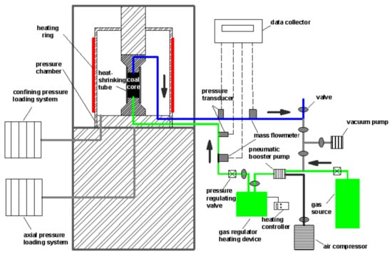 - Li, Z.Q.; Xian, X.F.; Long, Q.M. Experiment study of coal permeability under different temperature and stress. J. China Univ. Min. Technol. 2009, 38, 523–527. [Google Scholar]