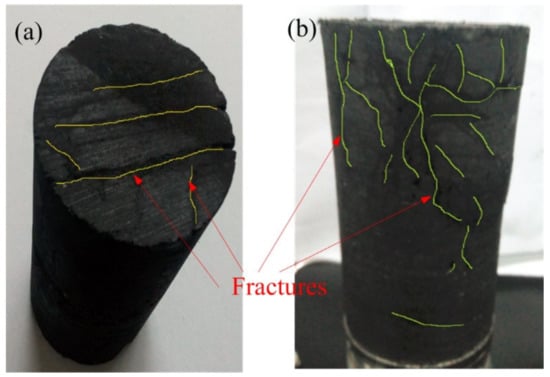 The naturally fractured coking coal samples used in the test were taken from the #J15 coal seam of the Pingdingshan Coalfield in China. The physical properties of the coal are shown in Table 1. The large coal blocks were cored, cut and grinded, after which samples with a diameter of 50 mm and a length of 100 mm were obtained. Some of the natural fractures in a typical coal sample are shown in Figure 2a, and fractures distribution of the coal sample after HTN2 injection are shown in Figure 2b.