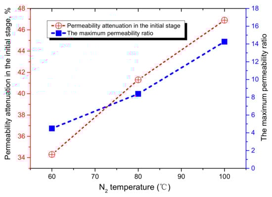The higher the N2 temperature is, the more intense the thermal expansions of the fracture surface and the matrix become. In accordance with Equations (A1), (A2) and (A4), due to the thermal expansion of the fracture surface, the fracture aperture is reduced. The greater permeability attenuation in the initial stage is therefore a result of the higher N2 temperature. When the N2 injection pressure is 4 MPa, the permeability attenuation values in the initial stage, which correspond to N2 temperatures of 60 °C, 80 °C and 100 °C, are 34.3%, 41.3% and 46.9%, respectively (Figure 5). With a continuous N2 injection, the coal global strain increases. According to Equations (A1), (A3) and (A4), the higher the N2 temperature, the more intense the integral thermal expansion becomes, which increases the fracture aperture. Thus, the higher the N2 temperature, the greater the maximum permeability ratio. When the N2 injection pressure is 4 MPa, the coal maximum permeability ratio values at N2 temperatures of 60 °C, 80 °C and 100 °C are 4.48, 8.38 and 14.25, respectively (Figure 5).